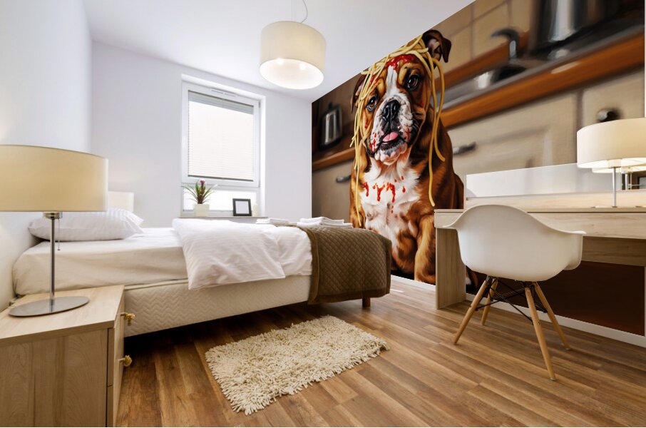 The content bulldog puppy sits next to his empty bowl completely covered in red sauce and stray noodles from his ears to his paws wearing a satisfied expression with droopy sleepy eyes. Digital Artwork.