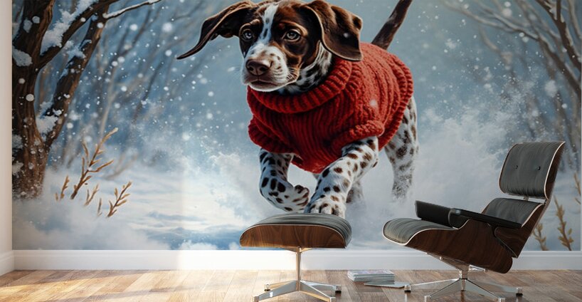 A content German Shorthaired Pointer puppy wearing a red knitted sweater with traces of snow rests peacefully on a soft indoor rug. The tired puppys relaxed expression shows satisfaction after an exciting winter adventure outside. Digital Artwork.