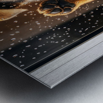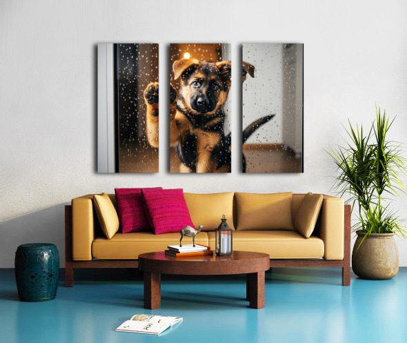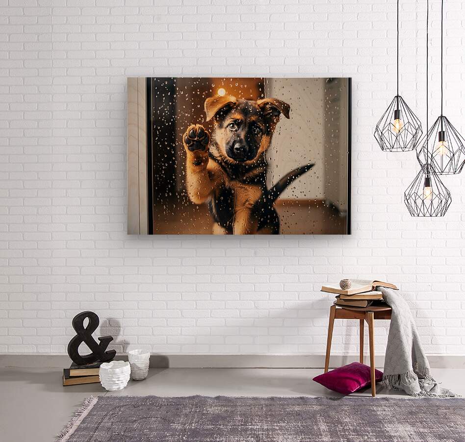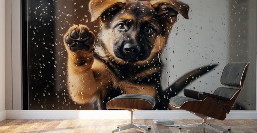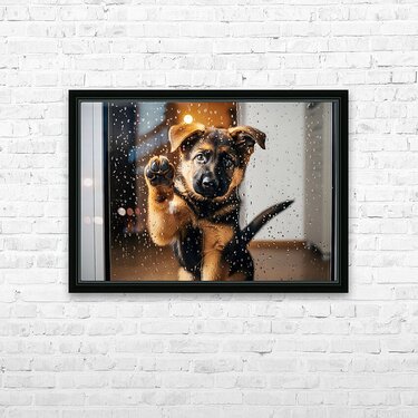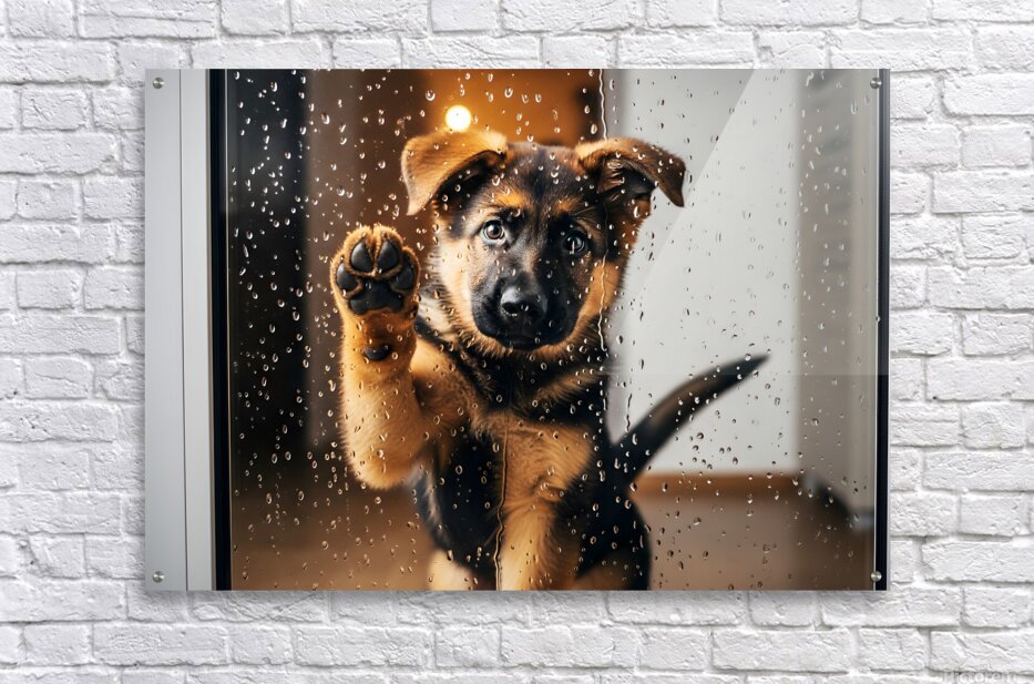 A German Shepherd puppy with brown and black fur sits with head tilted sideways looking confused and puzzled as raindrops continue streaming down the glass door Digital Artwork.