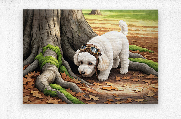 An adorable white poodle puppy wearing oversized aviator goggles stands eagerly at a garden path entrance. The fluffy puppys tail wags with excitement as colorful flowers bloom in soft focus around the scene. Digital Artwork.