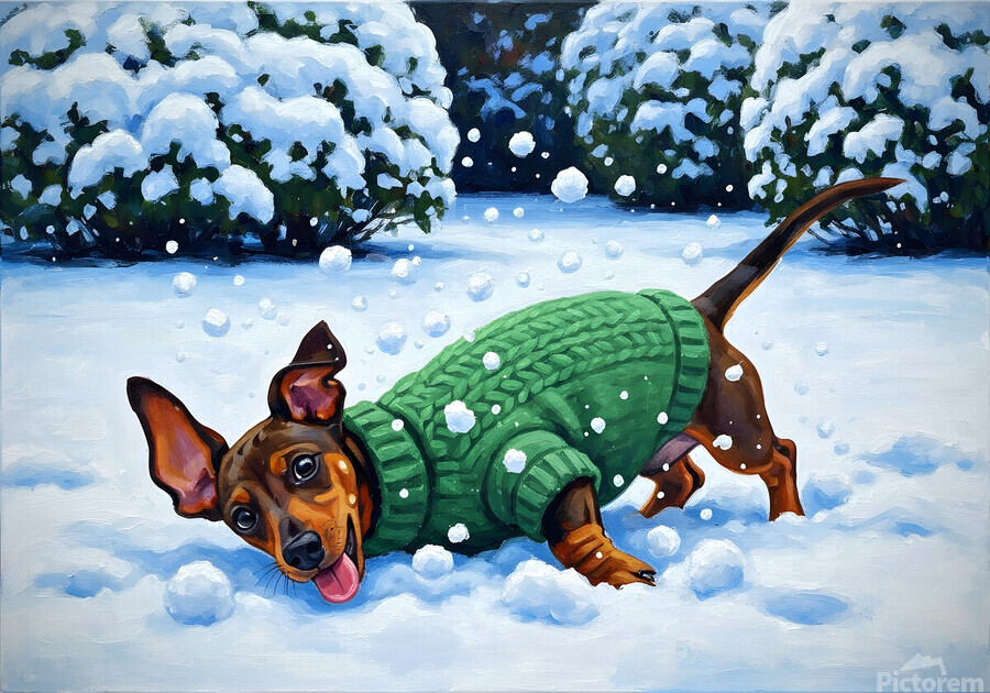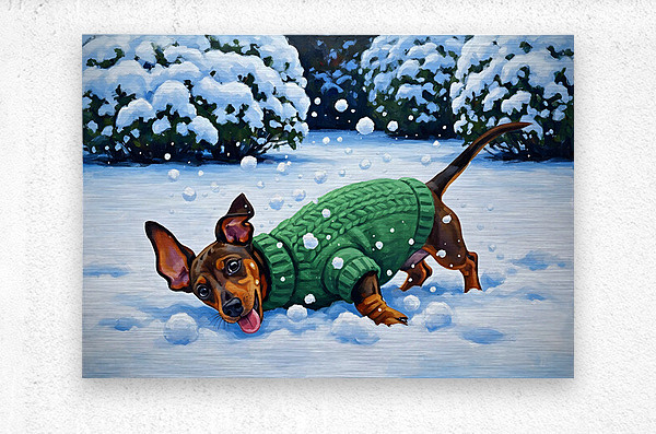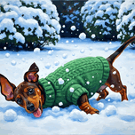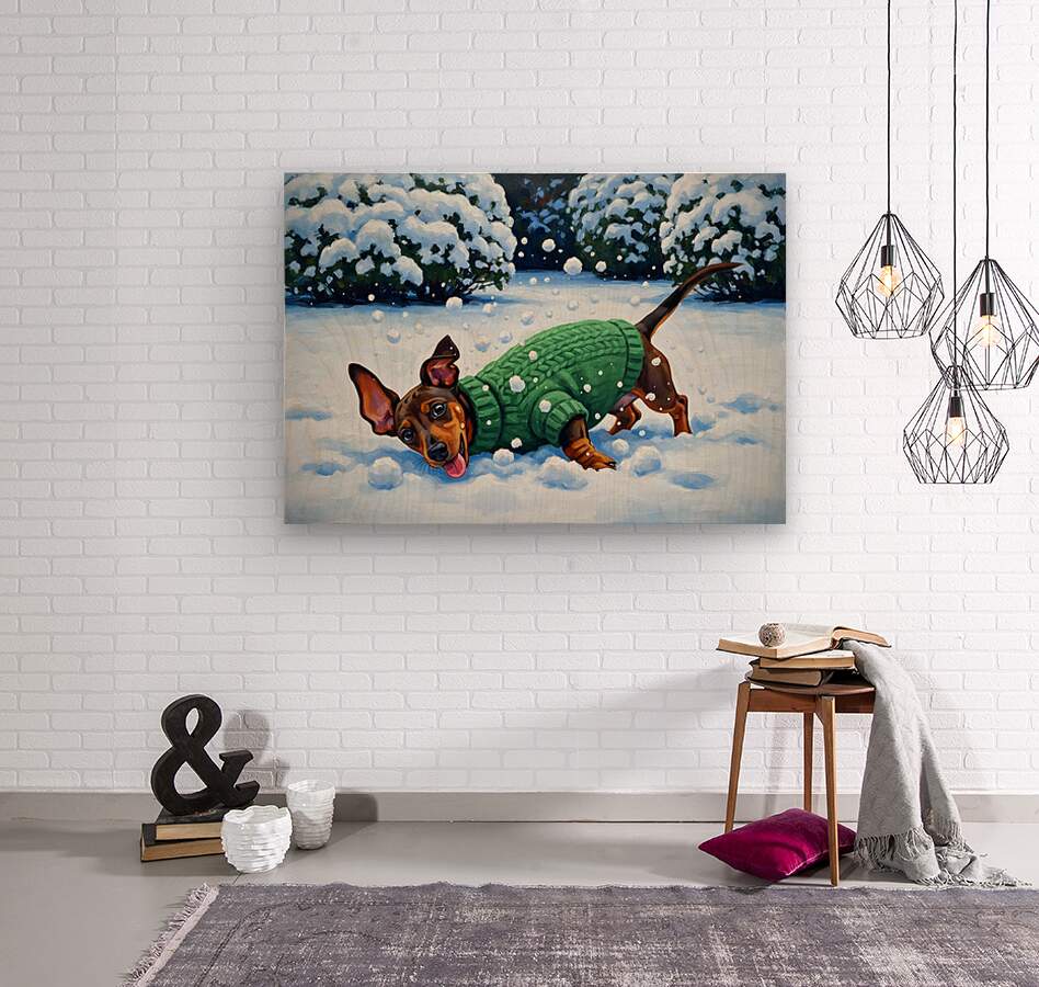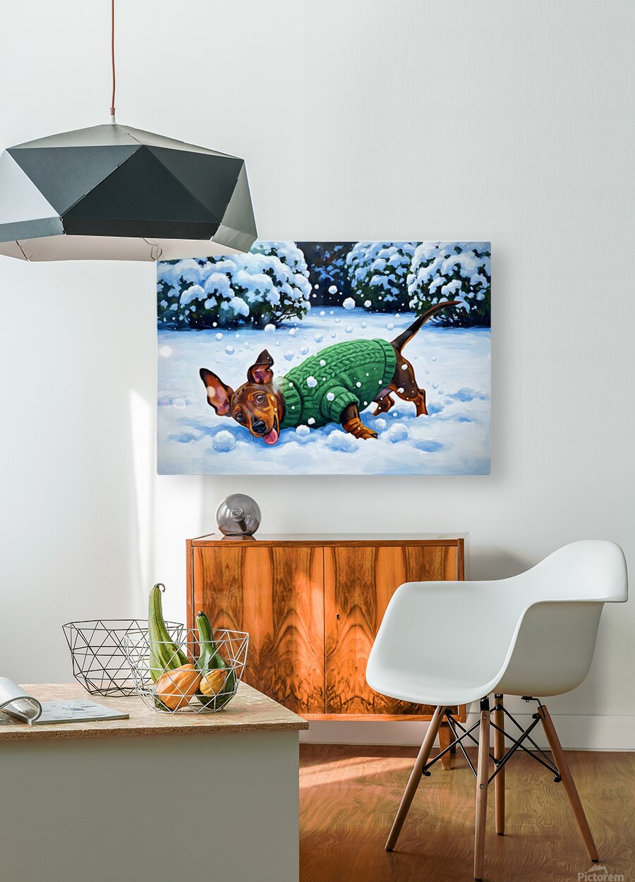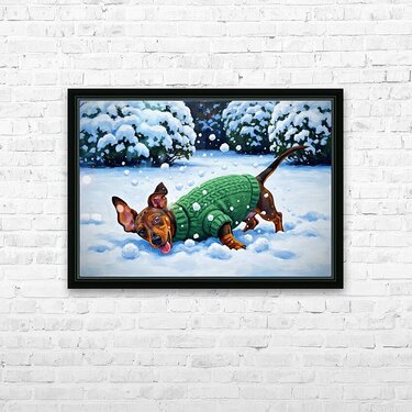 ABOUT THIS ARTWORK: SLEEPY DACHSHUND PUPPY WARMS UP BY COZY WINTER FIREPLACE