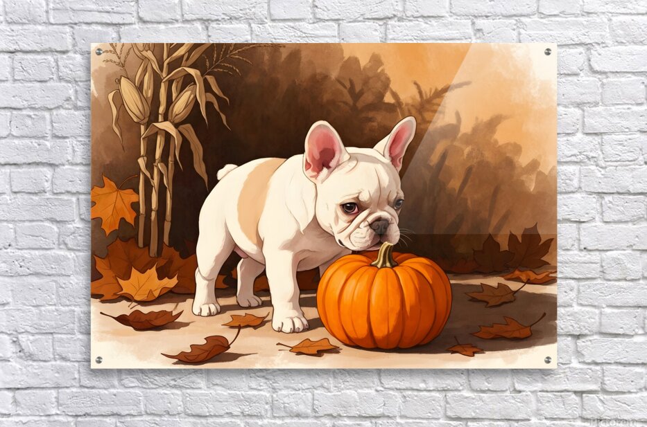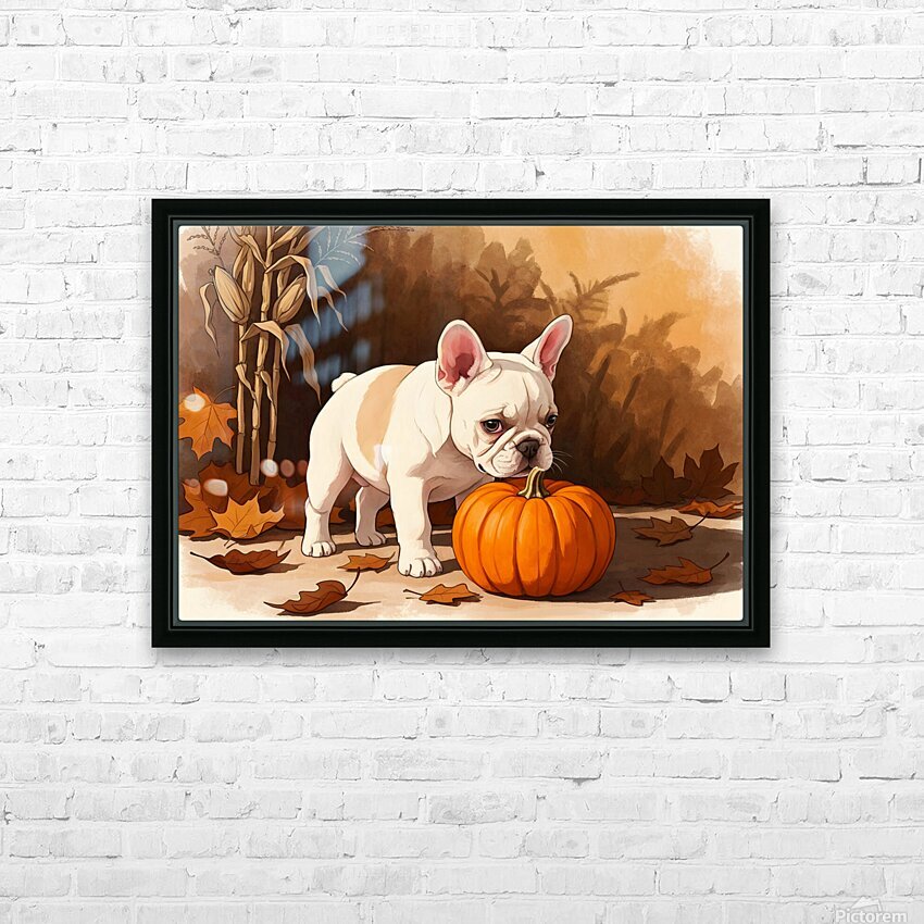 Get this artwork "French Bulldog Puppy Discovers Autumn Pumpkin Patch" in a framed print.
