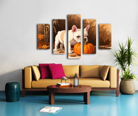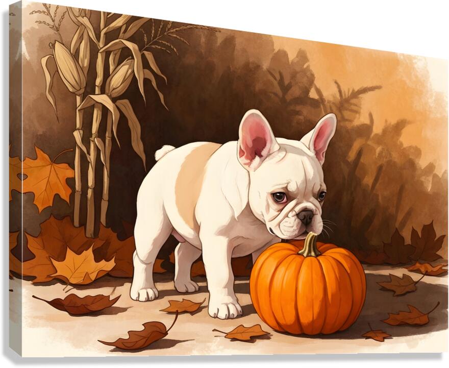 French Bulldog Puppy Discovers Autumn Pumpkin Patch Canvas print