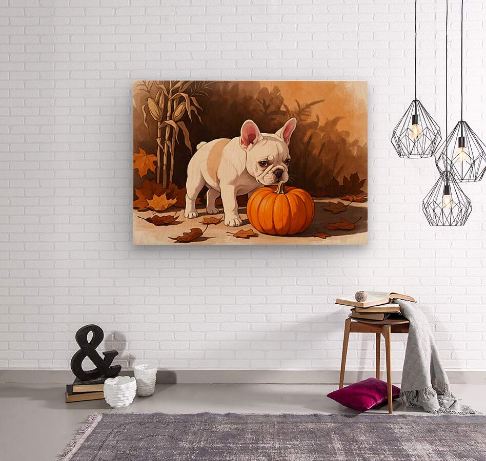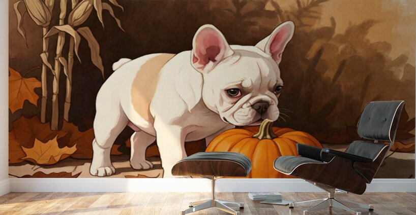 ABOUT THIS ARTWORK: FRENCH BULLDOG PUPPY DISCOVERS AUTUMN PUMPKIN PATCH