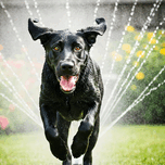 The thoroughly soaked German Shepherd puppy sits contentedly beside the sprinkler black and tan fur glistening with water droplets. The happy pup pants with satisfaction tongue out surrounded by wet grass and puddles. Digital Artwork.