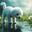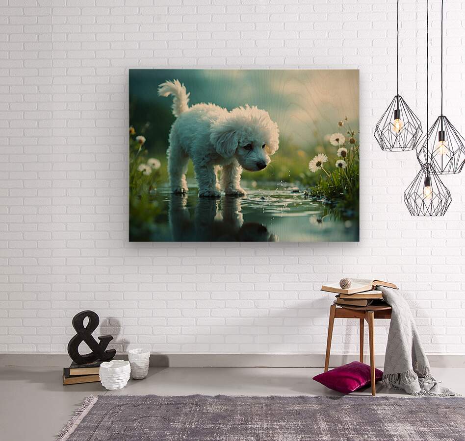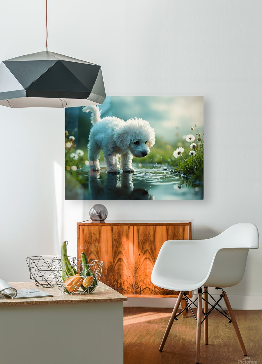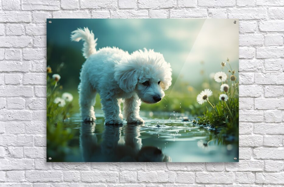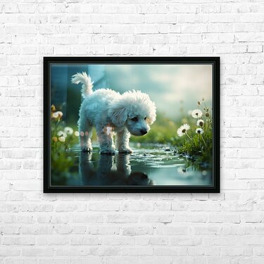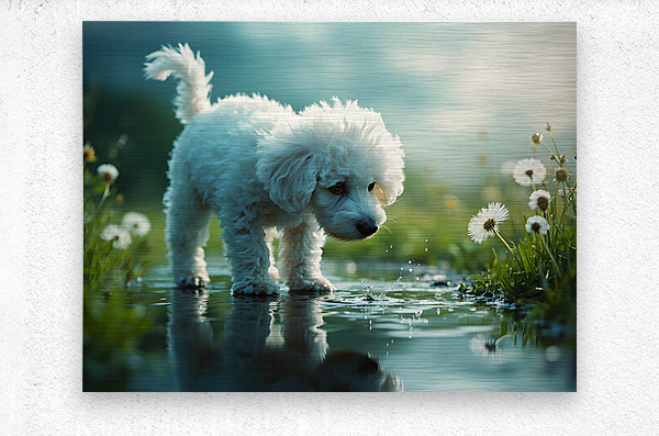 A white curly-haired poodle puppy stands beside a clear puddle gazing down with wonder at the waters surface. Her fluffy coat contrasts against the wet dark pavement with soft green vegetation blurred in the foreground. Digital Artwork.