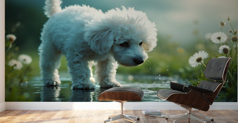 A white curly-haired poodle puppy stands beside a clear puddle gazing down with wonder at the waters surface. Her fluffy coat contrasts against the we...[+]