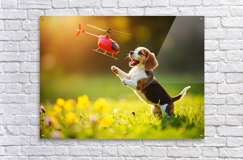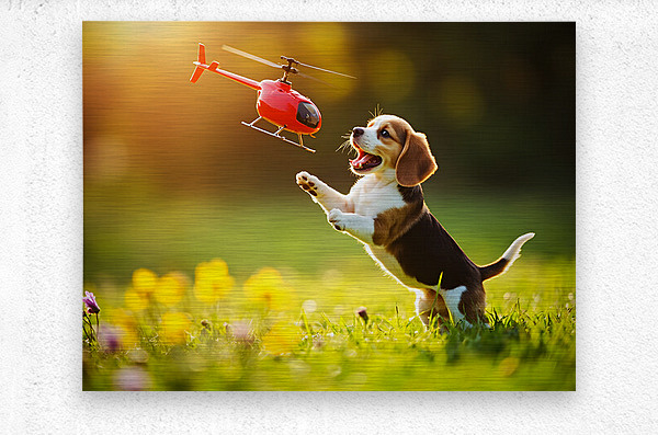 A brown and white beagle puppy sits on green grass gazing up with wonder at a red remote-controlled helicopter hovering overhead. The puppys ears are perked forward and tail wagging with excitement as colorful garden flowers blur softly in the foreground. Digital Artwork.