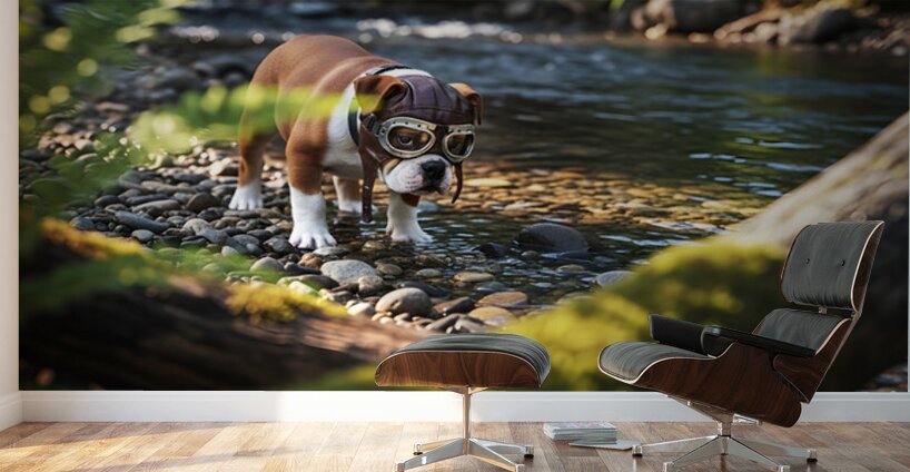 A content brown and white bulldog puppy wearing crooked aviator goggles rests peacefully on soft grass beneath an oak tree. The tired adventurer enjoys the golden afternoon light after exploring. Digital Artwork.