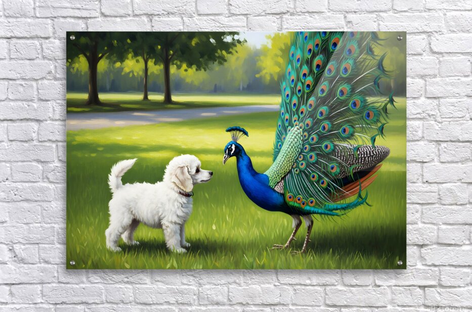 A peacock shows off its complete tail feather display in a magnificent fan of blues greens and eye patterns while a tiny white poodle puppy gazes up in complete wonder and delight. Digital Artwork.