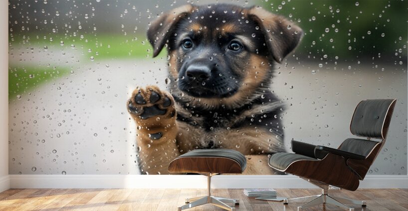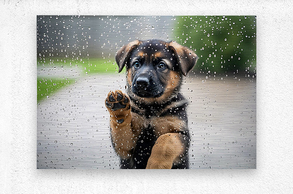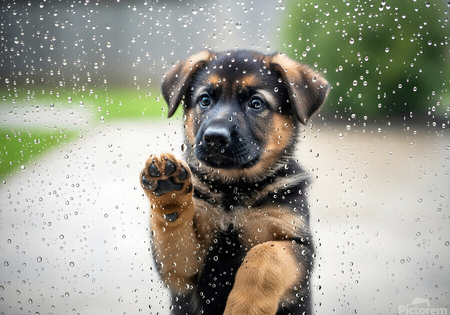 A young German Shepherd puppy with fluffy brown and black coat sits indoors gazing up at a glass door covered in streaming raindrops from outside rain Digital Artwork.