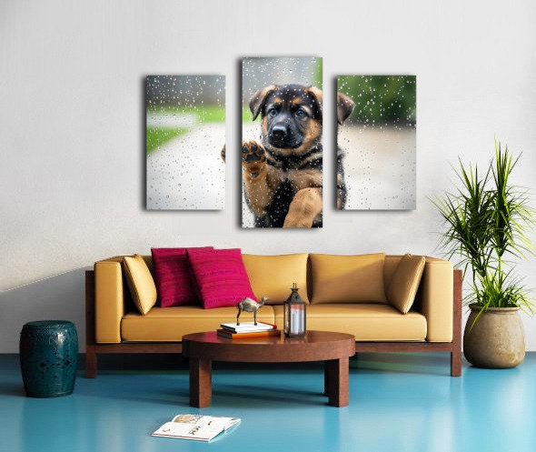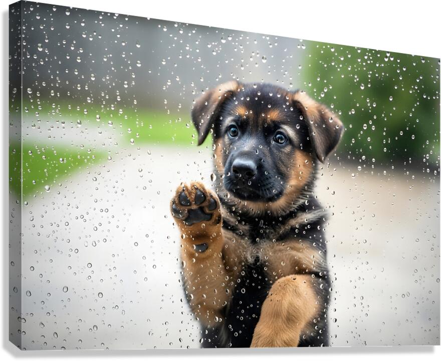 German Shepherd Puppy Discovers Raindrops On Glass Door Canvas print