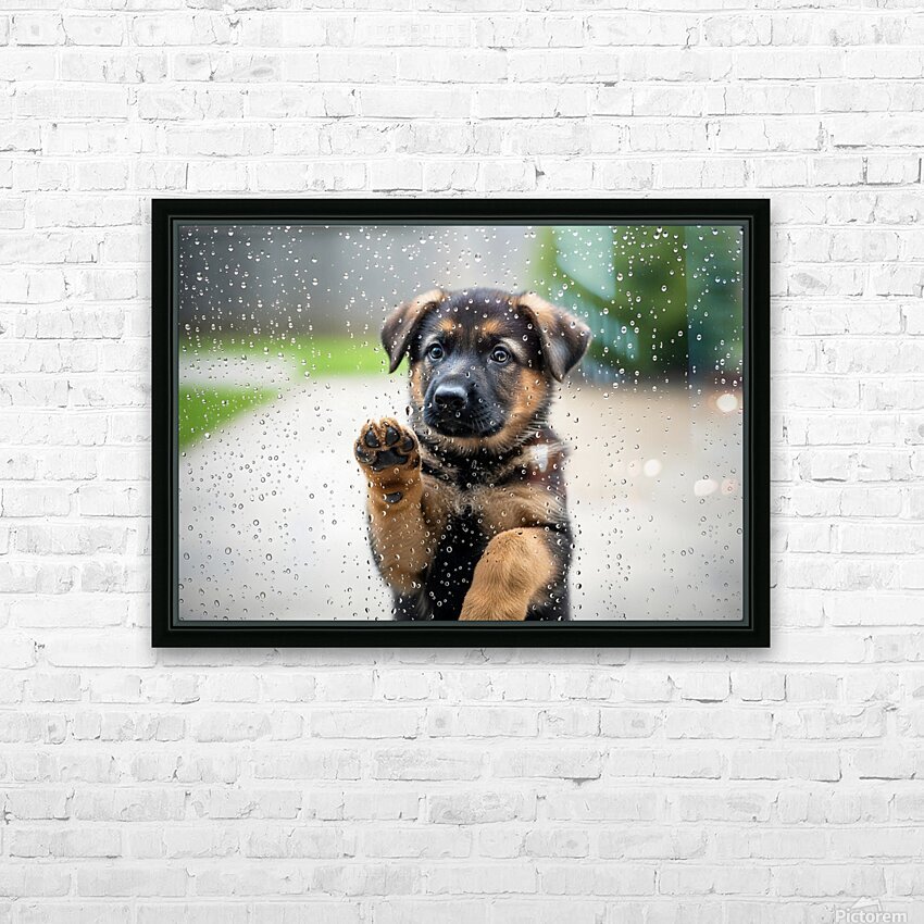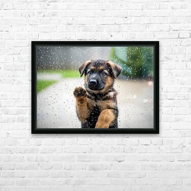 Get this artwork "German Shepherd Puppy Discovers Raindrops On Glass Door" in a framed print.