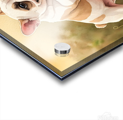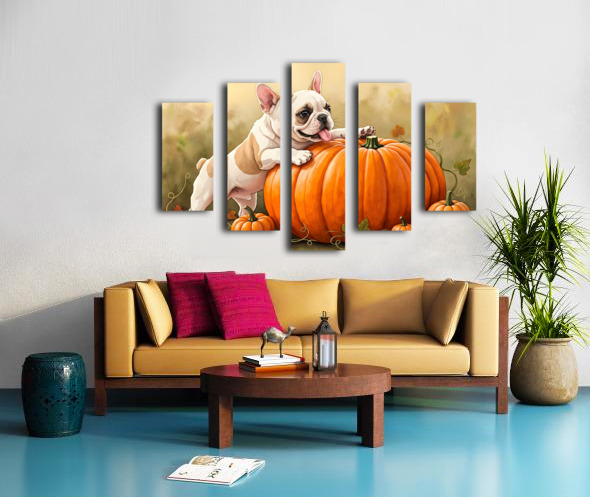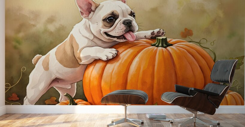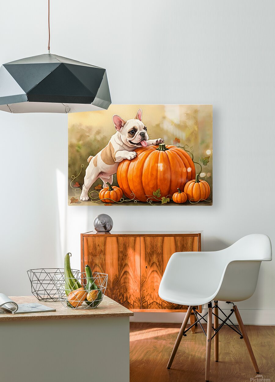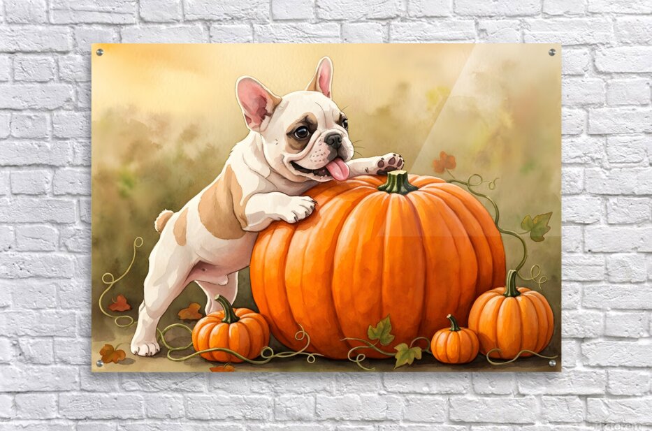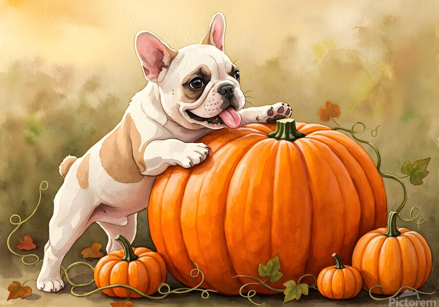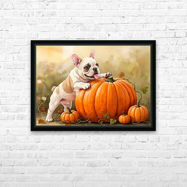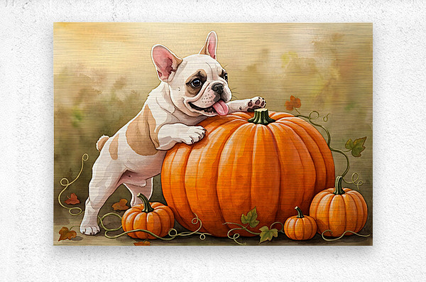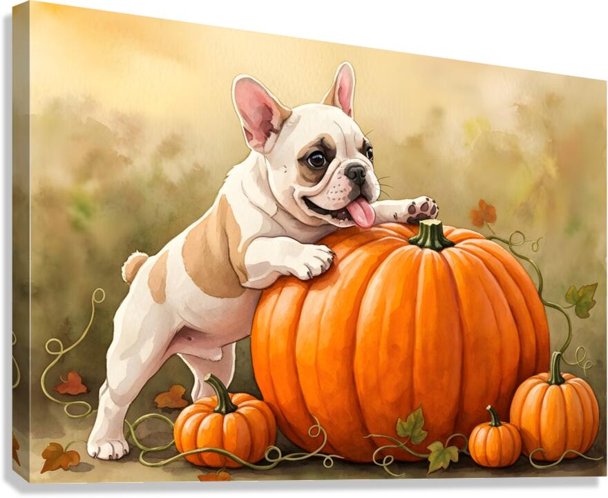 ABOUT THIS ARTWORK: HAPPY FRENCH BULLDOG PUPPY RESTS IN PUMPKIN PATCH