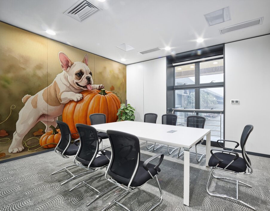 The cream and fawn French Bulldog puppy sits peacefully among orange pumpkins with its head tilted slightly and tail wagging. Colorful autumn leaves in shades of red yellow and brown create a beautiful carpet around the contented puppy. Digital Artwork.