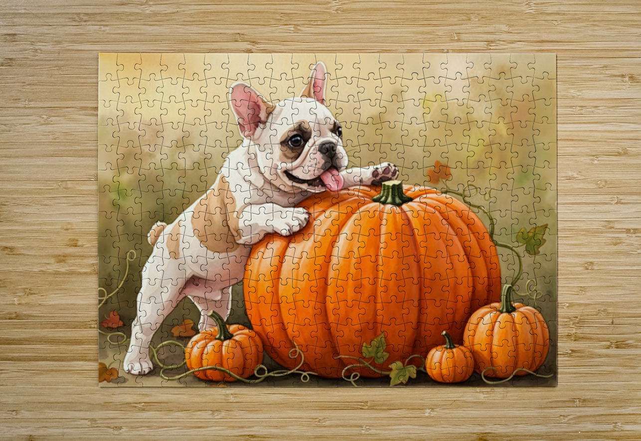 Happy French Bulldog Puppy Rests In Pumpkin Patch Puppy Prints Puzzle printing