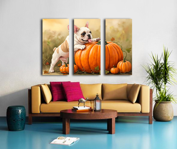 Happy French Bulldog Puppy Rests In Pumpkin Patch Canvas print