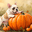 The cream and fawn French Bulldog puppy sits peacefully among orange pumpkins with its head tilted slightly and tail wagging. Colorful autumn leaves i...[+]