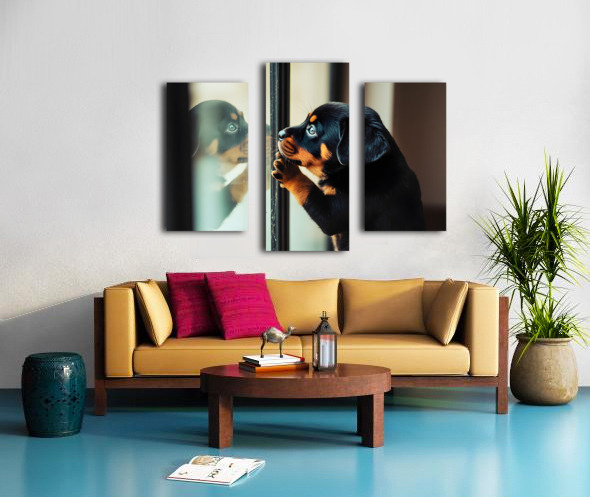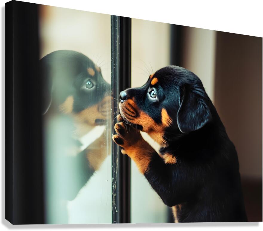 The Rottweiler puppy sits quietly before the glass doors in a moment of contemplation studying its reflection with newfound understanding and calm curiosity Digital Artwork.
