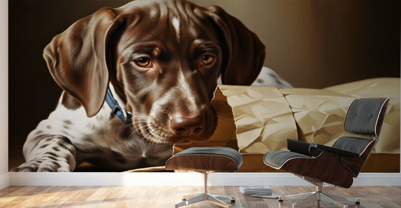Get this artwork "German Shorthaired Pointer Puppy Discovers Shopping Bag" in a framed print.