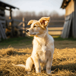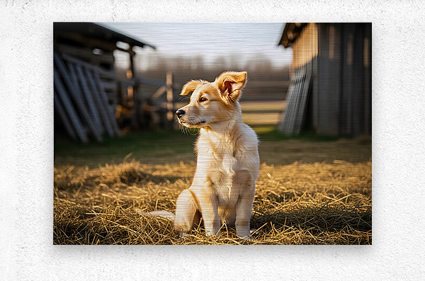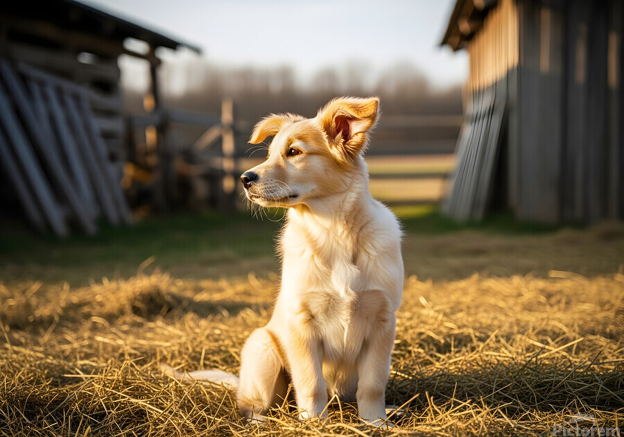 A tired golden retriever puppy with cream and golden fur rests peacefully in soft hay with sleepy half-closed eyes looking content and drowsy in gentle evening light Digital Artwork.