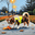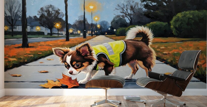 A small brown and white Chihuahua puppy stands by a front door wearing a bright yellow reflective vest. The puppys tail wags with excitement as evening light creates a warm glow around the scene. Digital Artwork.