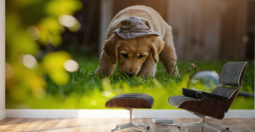 An adorable golden retriever puppy with bright golden fur sits in a garden wearing a detective hat and gripping a magnifying glass ready to solve myst...[+]