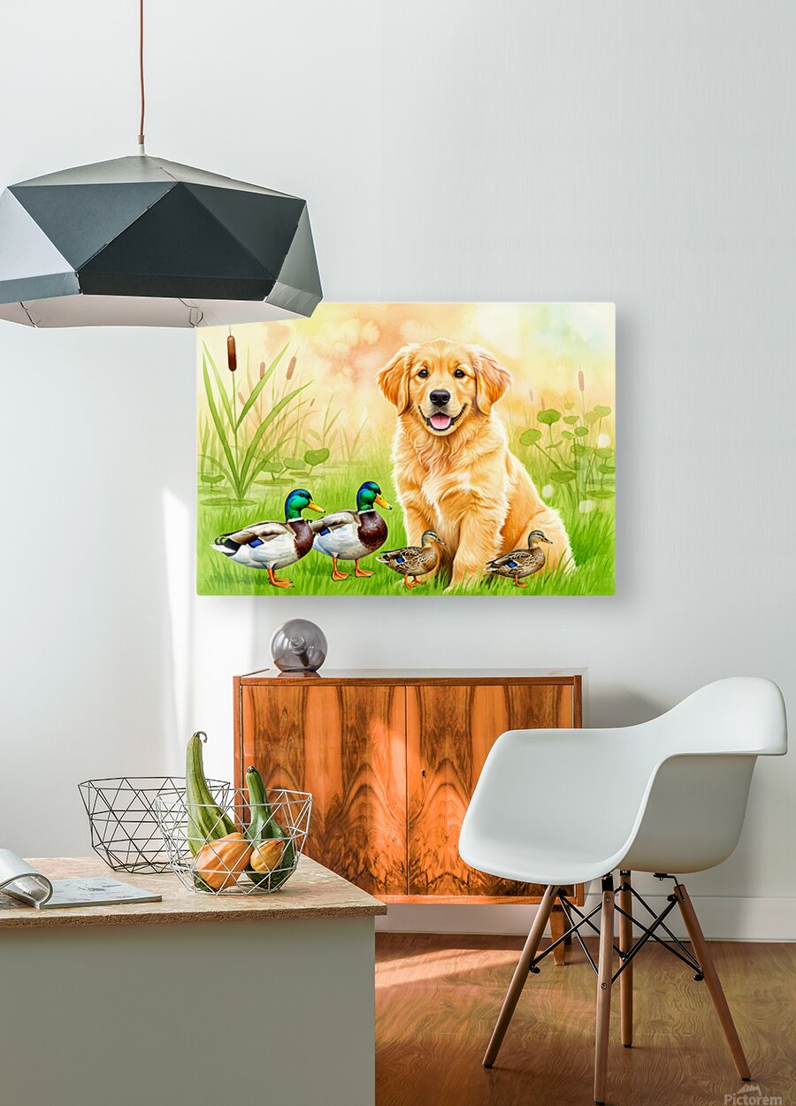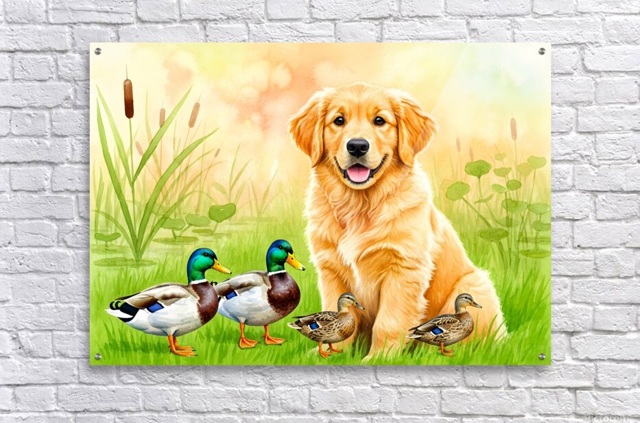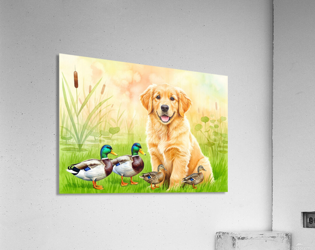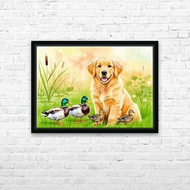 Get this artwork "Golden Retriever Puppy Discovers The Pond" in a framed print.