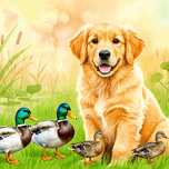 A young golden retriever puppy with fluffy cream fur explores near a peaceful pond walking through lush green grass with attentive ears and bright curious eyes in natural morning lighting Digital Artwork.