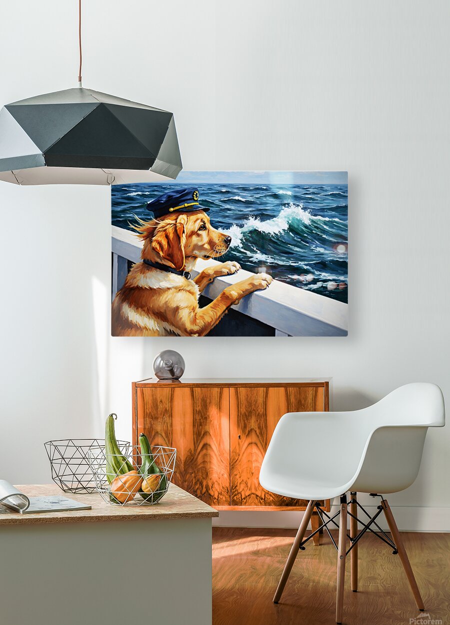 A fluffy golden Labrador puppy with a tiny navy sailor hat perched on its head sits eagerly on a wooden boat deck. The puppys brown eyes sparkle with excitement as ocean waves stretch into the distance under a bright blue sky. Digital Artwork.