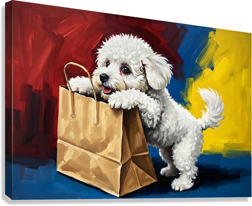 Bichon Frise Puppy Discovers Mysterious Shopping Bag Canvas print