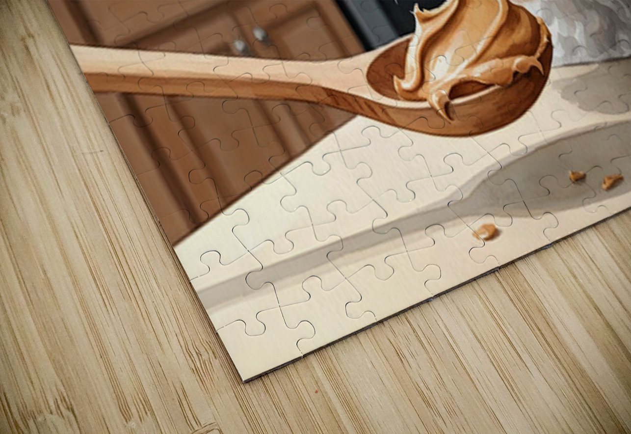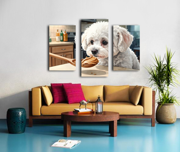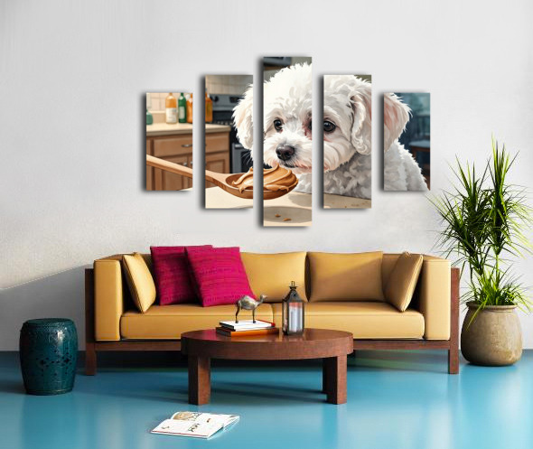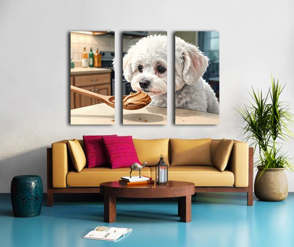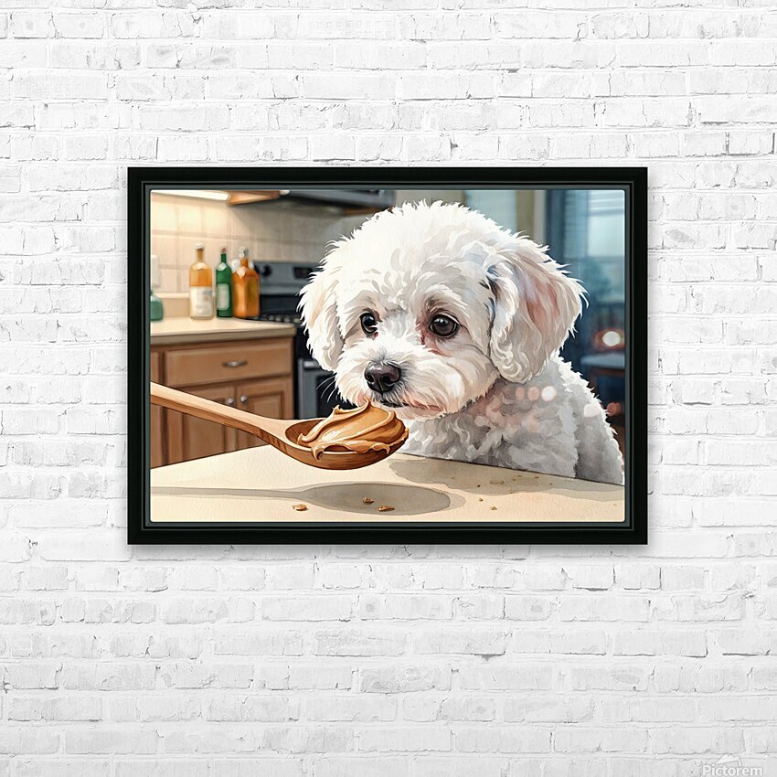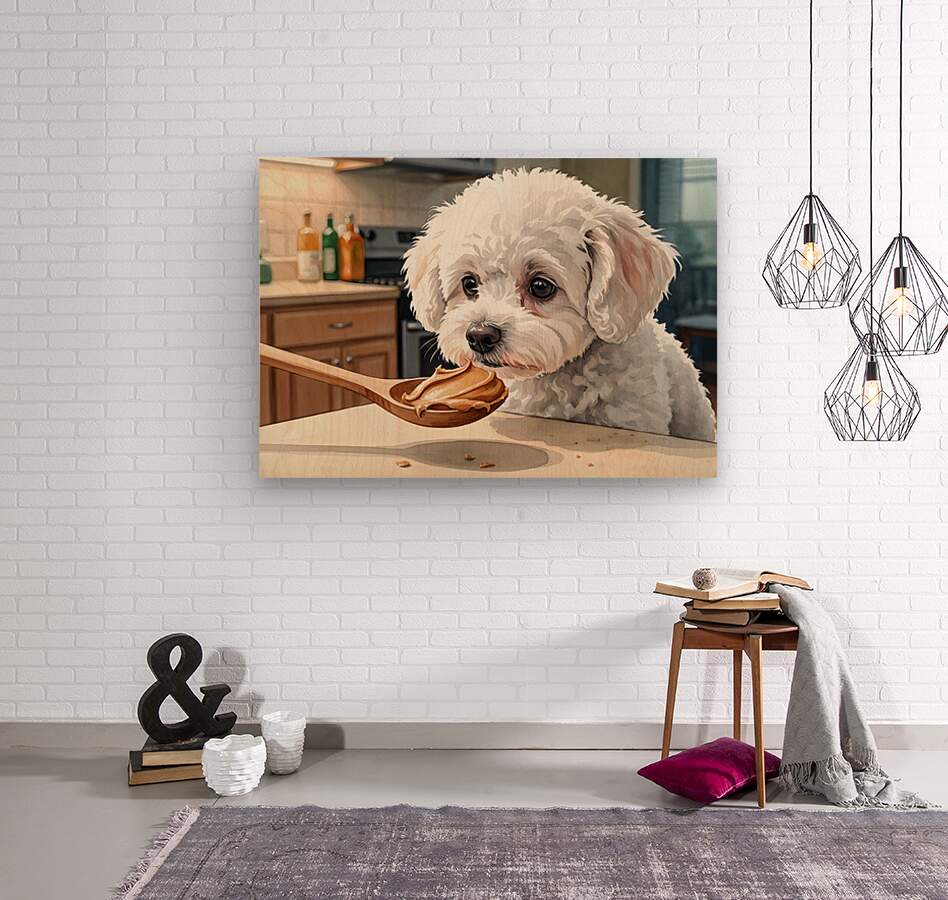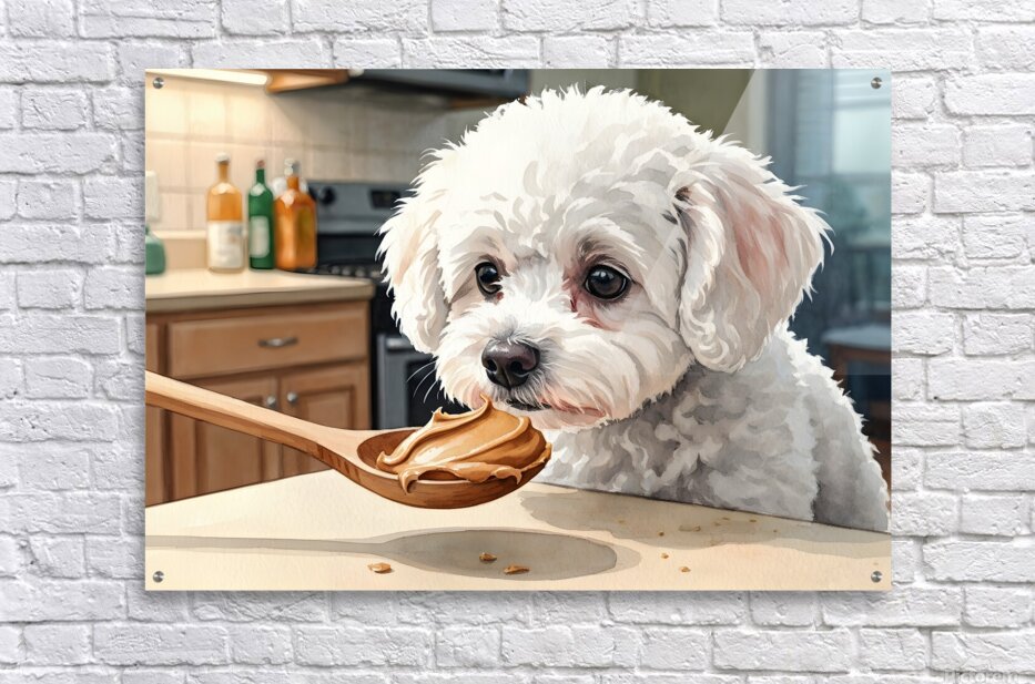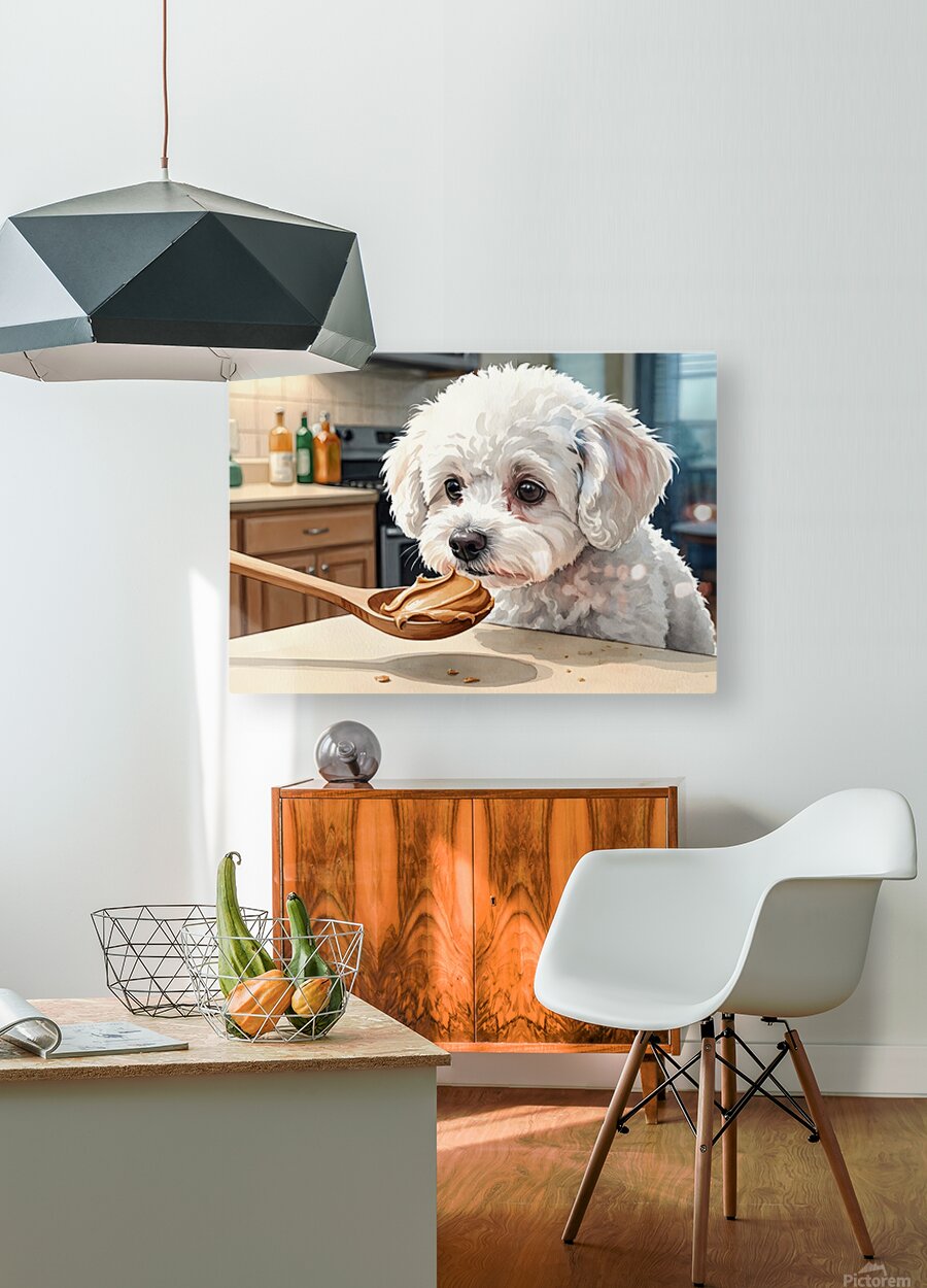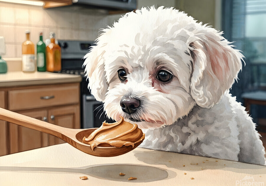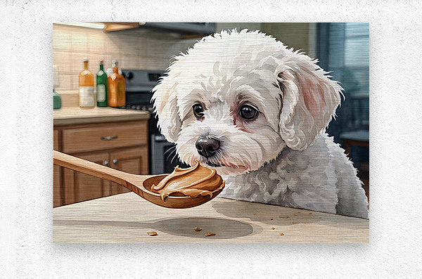A fluffy white Bichon Frise puppy sits attentively on a kitchen floor gazing upward with bright curious eyes at a wooden spoon containing smooth brown peanut butter held above Digital Artwork.