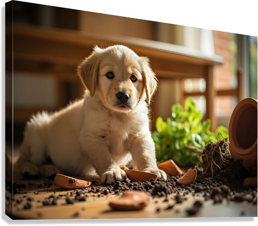 A sweet golden retriever puppy with fluffy cream fur sits with lowered head and drooping ears showing a remorseful expression. Dark potting soil surrounds the puppys paws with a fallen green plant nearby creating evidence of the accident. Digital Artwork.