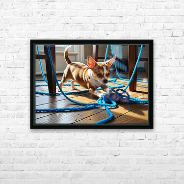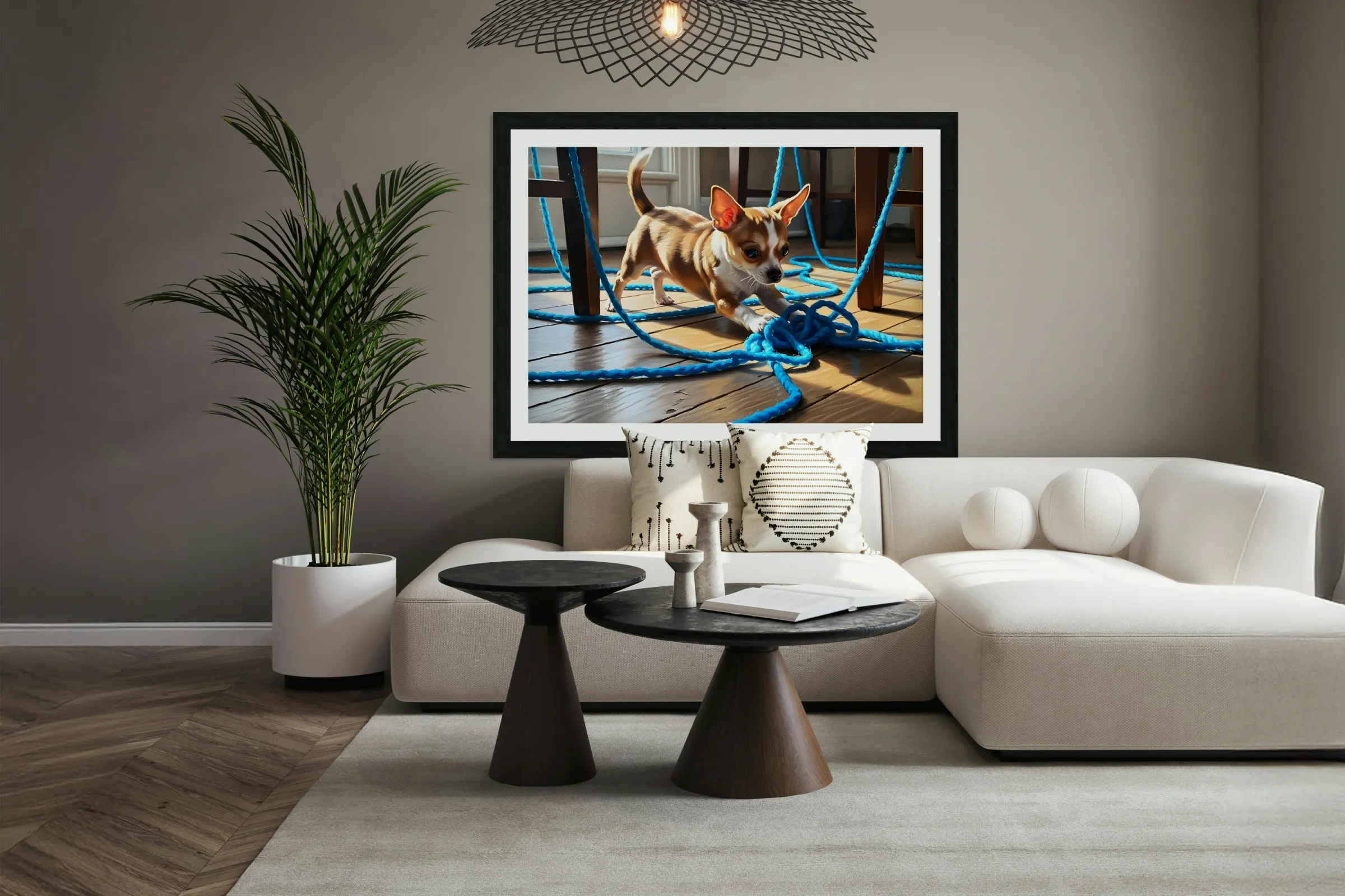 Chihuahua Puppy Discovers Yarn Ball Picture Frame Printing