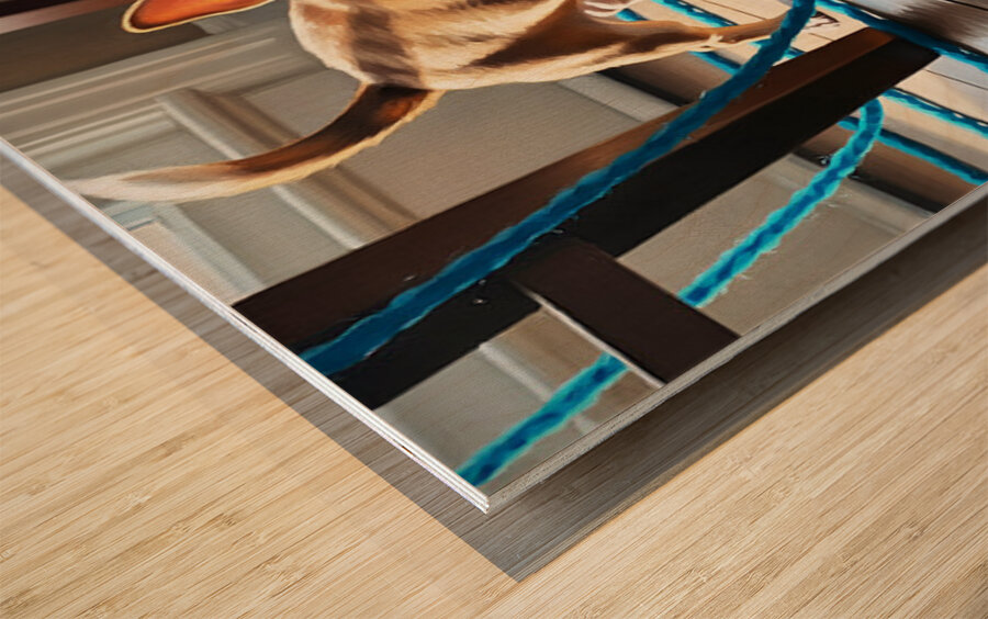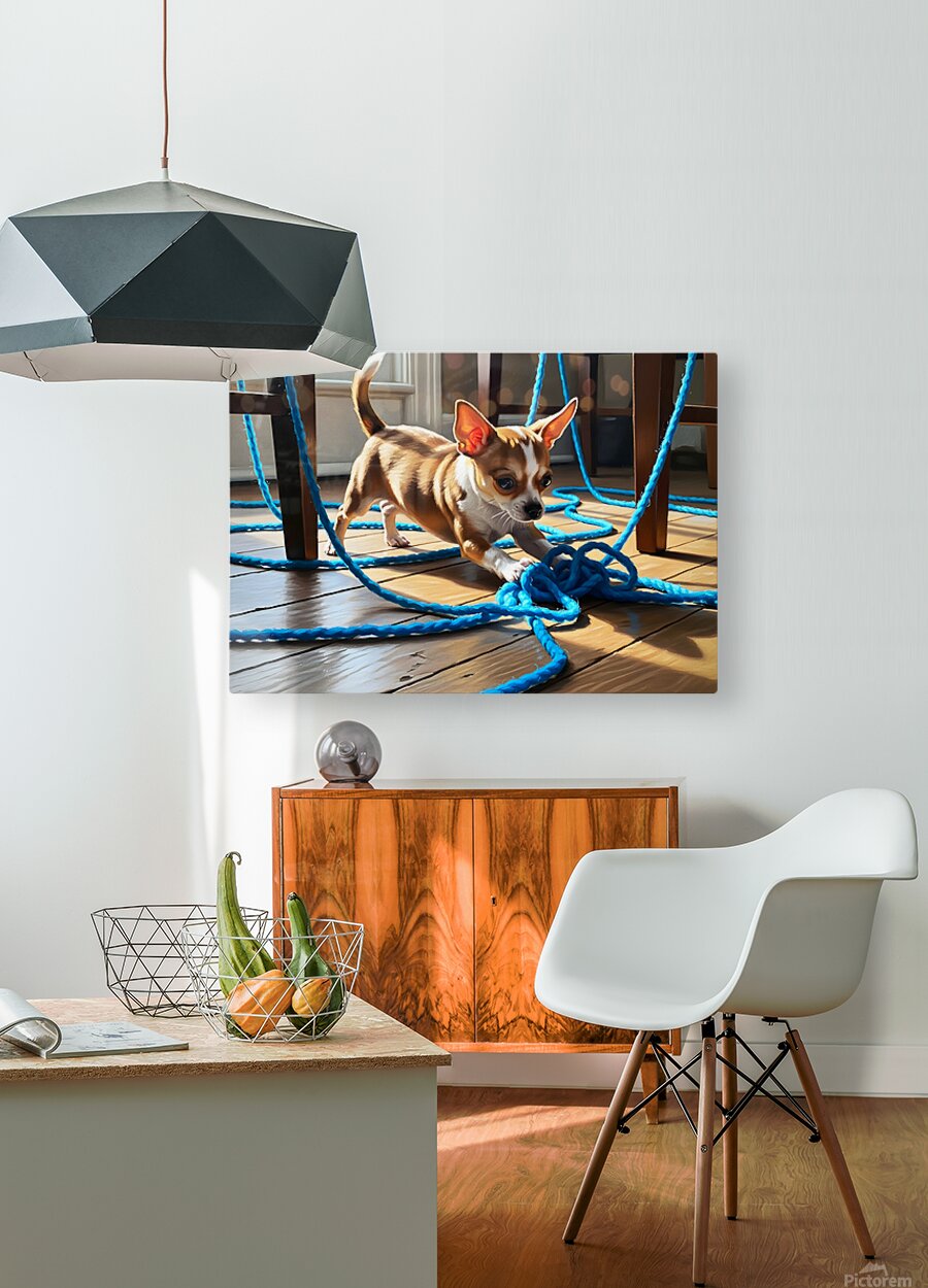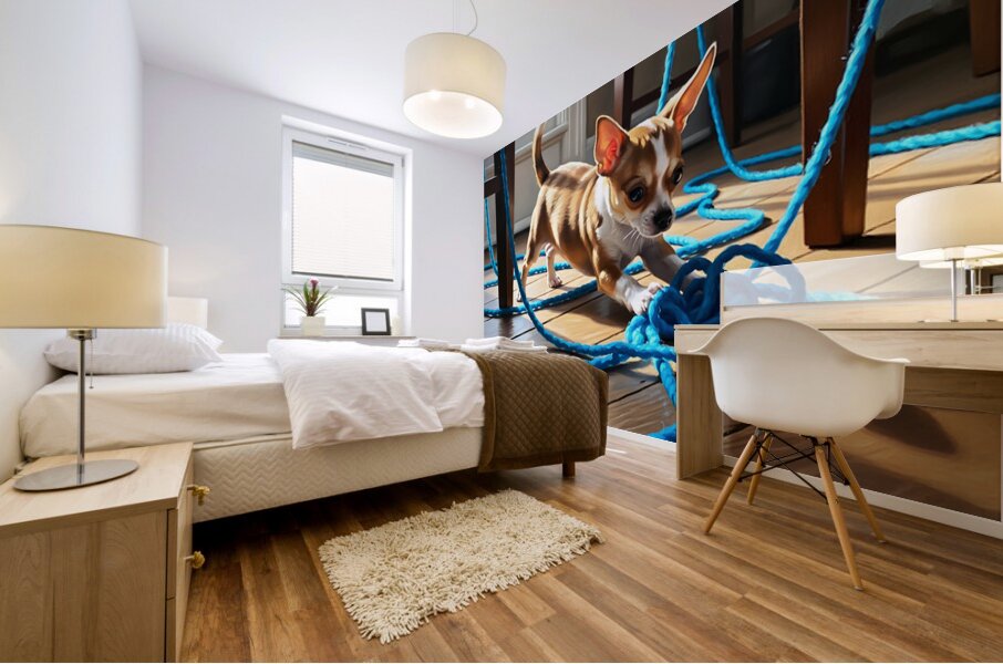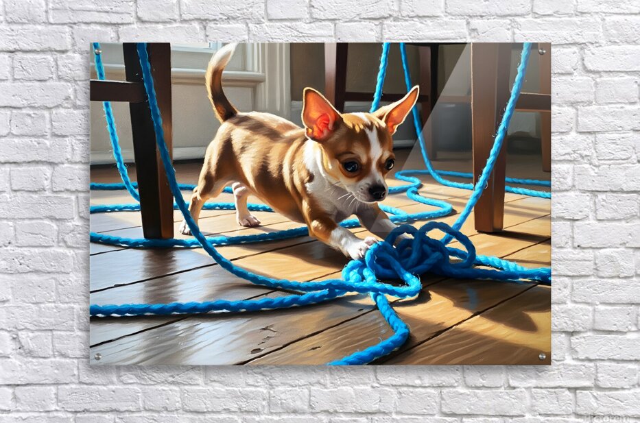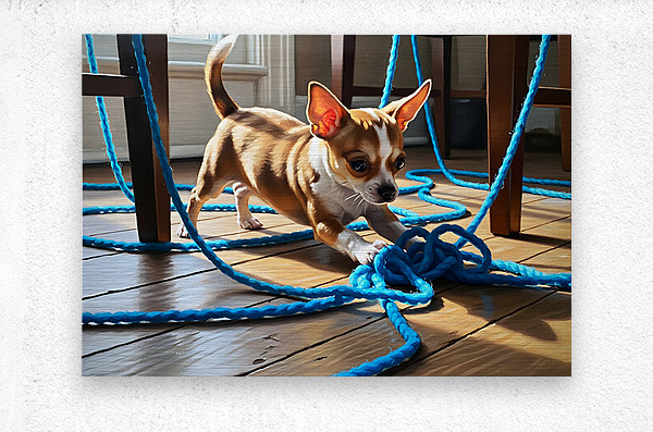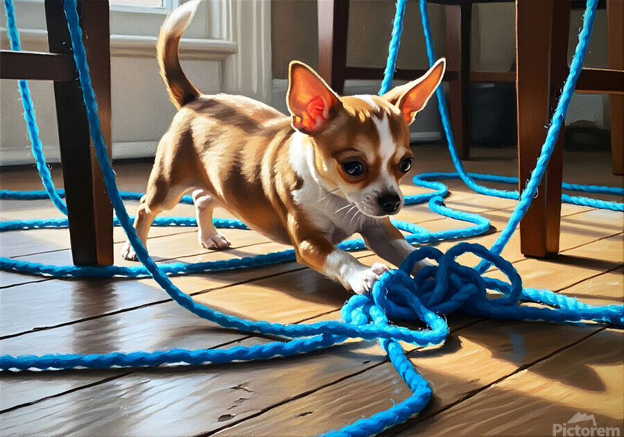 A small tan and white Chihuahua puppy sits surrounded by bright blue yarn that has unraveled across a wooden floor. The tiny dog looks startled with wide eyes blue yarn strands wrapped around its little paws and body. Digital Artwork.