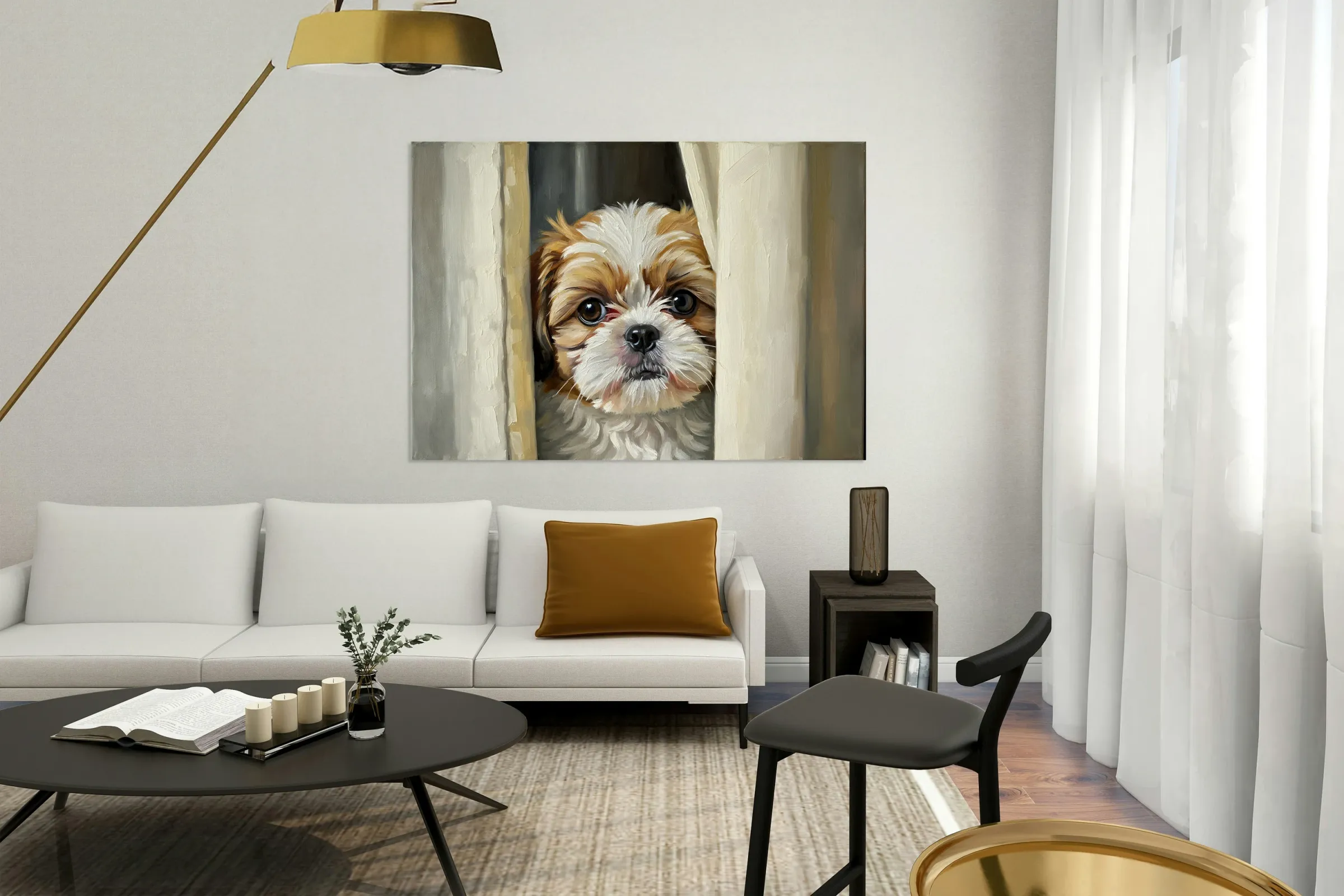 A adorable Shih Tzu puppy with golden and white fluffy fur attempts to hide behind a cream curtain in a warm living room but their bushy tail gives away their location as it peeks out from the fabric Digital Artwork.