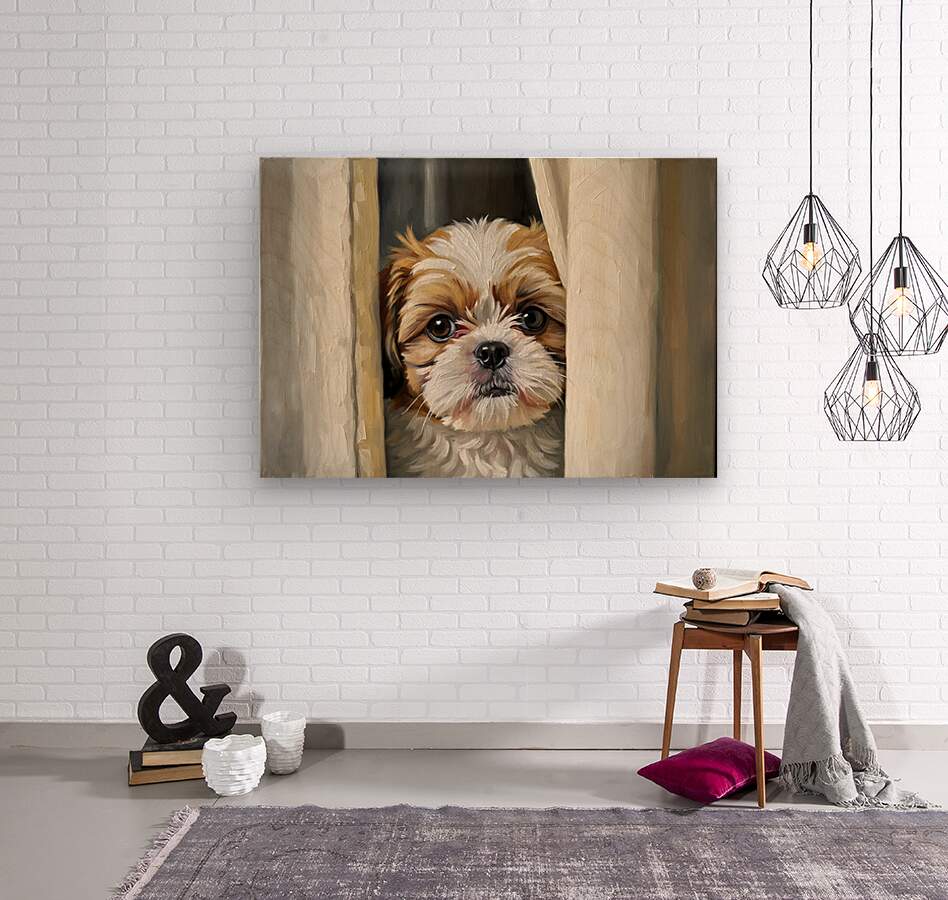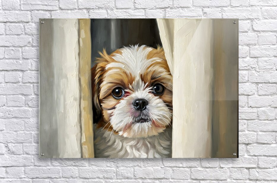 ABOUT THIS ARTWORK: SHIH TZU PUPPYS PERFECT HIDING SPOT BEHIND CURTAIN
