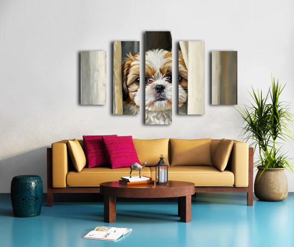 A adorable Shih Tzu puppy with golden and white fluffy fur attempts to hide behind a cream curtain in a warm living room but their bushy tail gives away their location as it peeks out from the fabric Digital Artwork.