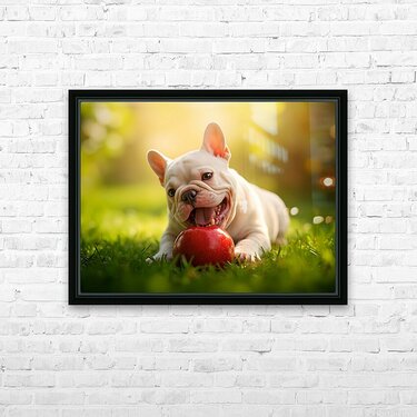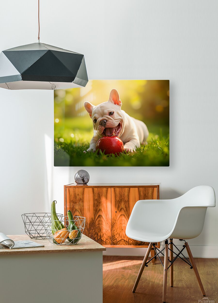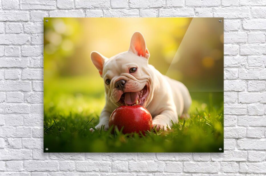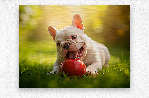 The cream French Bulldog puppy sits happily beside a partially eaten apple on the orchard grass. Sweet apple juice glistens on the puppys chin as it displays a content and satisfied expression after its fruity adventure. Digital Artwork.