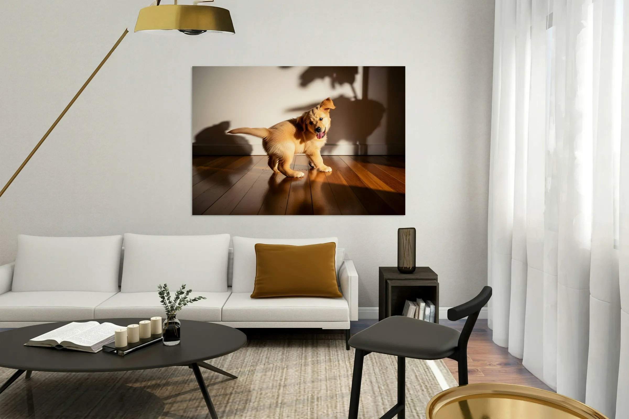 A golden retriever puppy with fluffy golden fur lies peacefully on wooden flooring tongue hanging out from exhaustion. The puppy appears content and drowsy after an energetic play session with shadows on the wall. Digital Artwork.