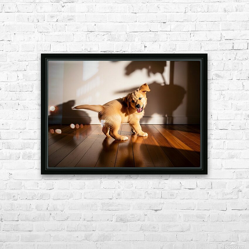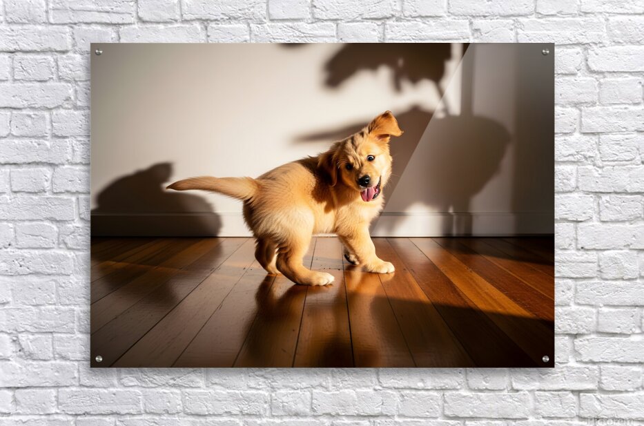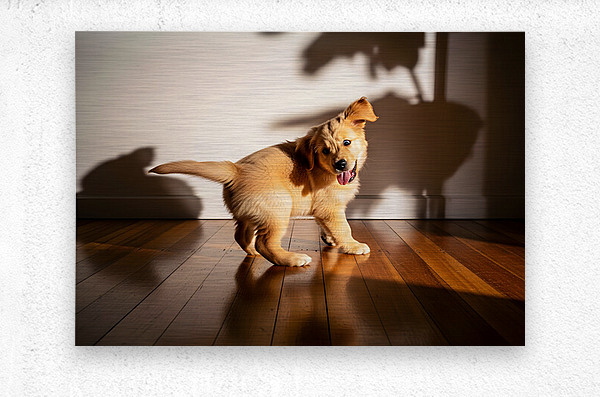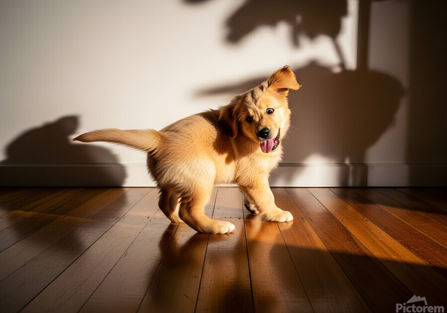 A golden retriever puppy with fluffy golden fur lies peacefully on wooden flooring tongue hanging out from exhaustion. The puppy appears content and drowsy after an energetic play session with shadows on the wall. Digital Artwork.