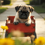 The adorable tan and black pug puppy curls up peacefully in the red wagon looking sleepy and satisfied after the exciting journey. Soft flowers create...[+]