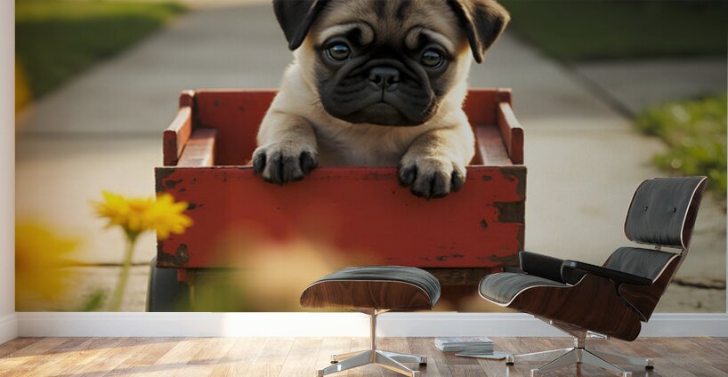 The adorable tan and black pug puppy curls up peacefully in the red wagon looking sleepy and satisfied after the exciting journey. Soft flowers create a dreamy tranquil atmosphere. Digital Artwork.