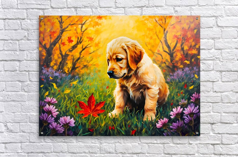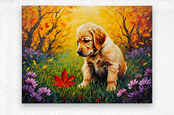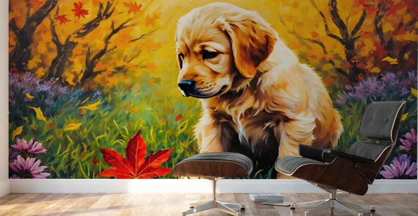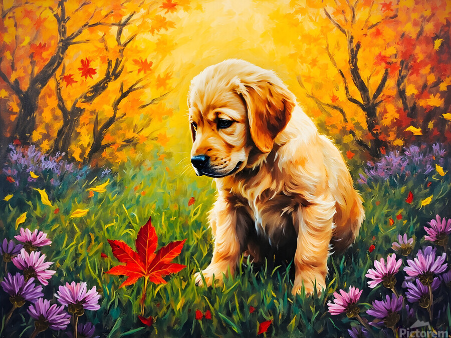ABOUT THIS ARTWORK: HAPPY GOLDEN RETRIEVER PUPPY DECORATED WITH LEAVES