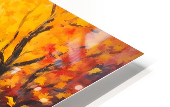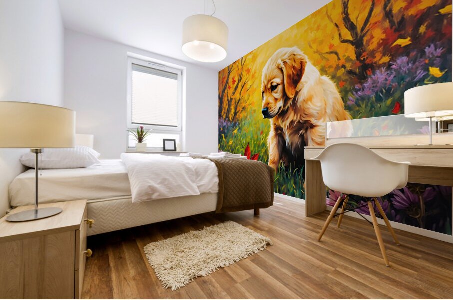 A joyful golden retriever puppy runs across the grass with autumn leaves of orange red and yellow colors playfully stuck in its fluffy golden coat. The puppy displays a happy expression with tongue hanging out looking delighted with its leafy decorations. Digital Artwork.