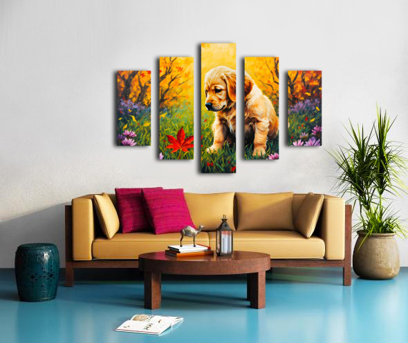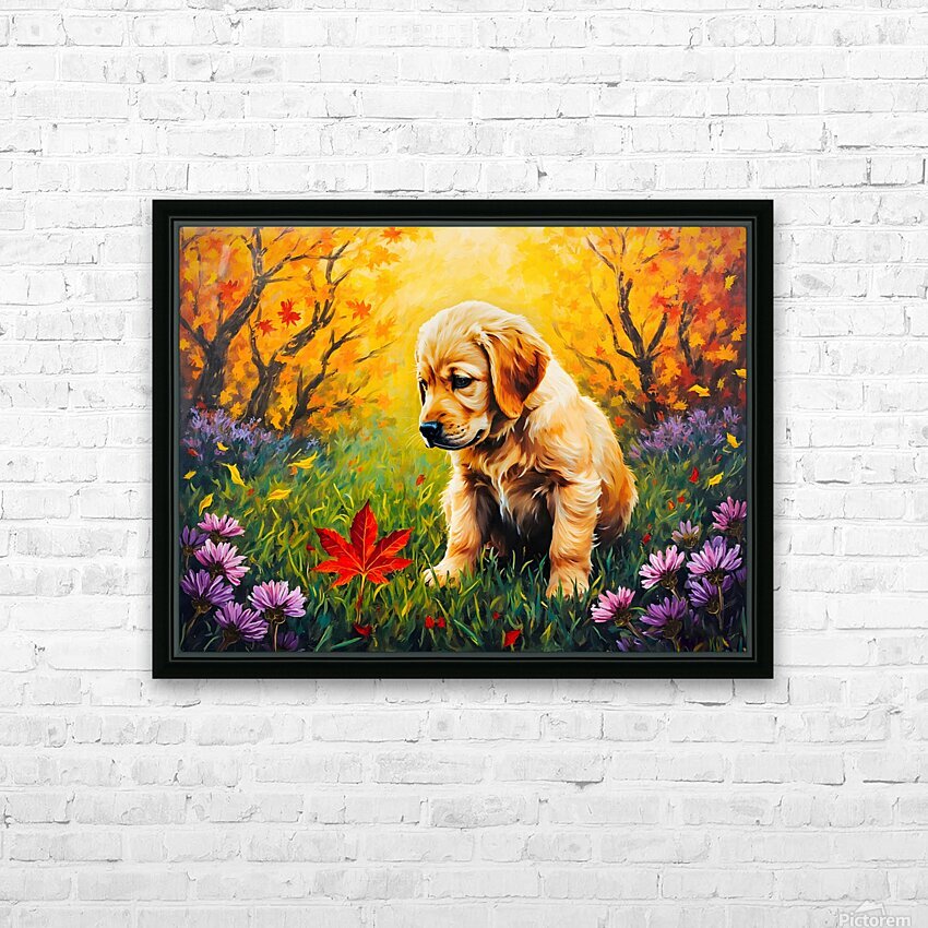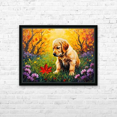 Happy Golden Retriever Puppy Decorated With Leaves Picture Frame Printing