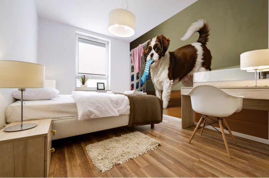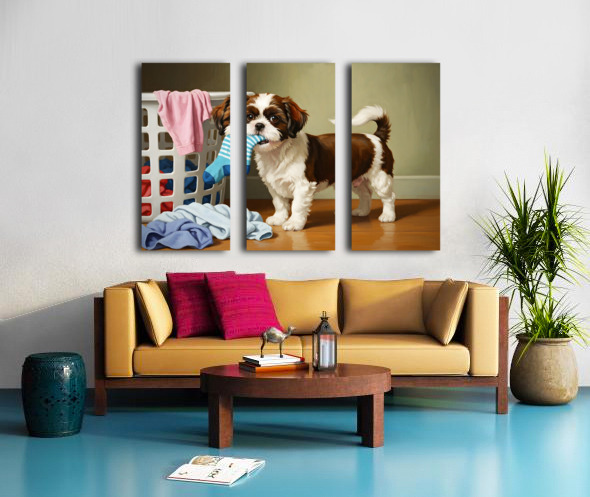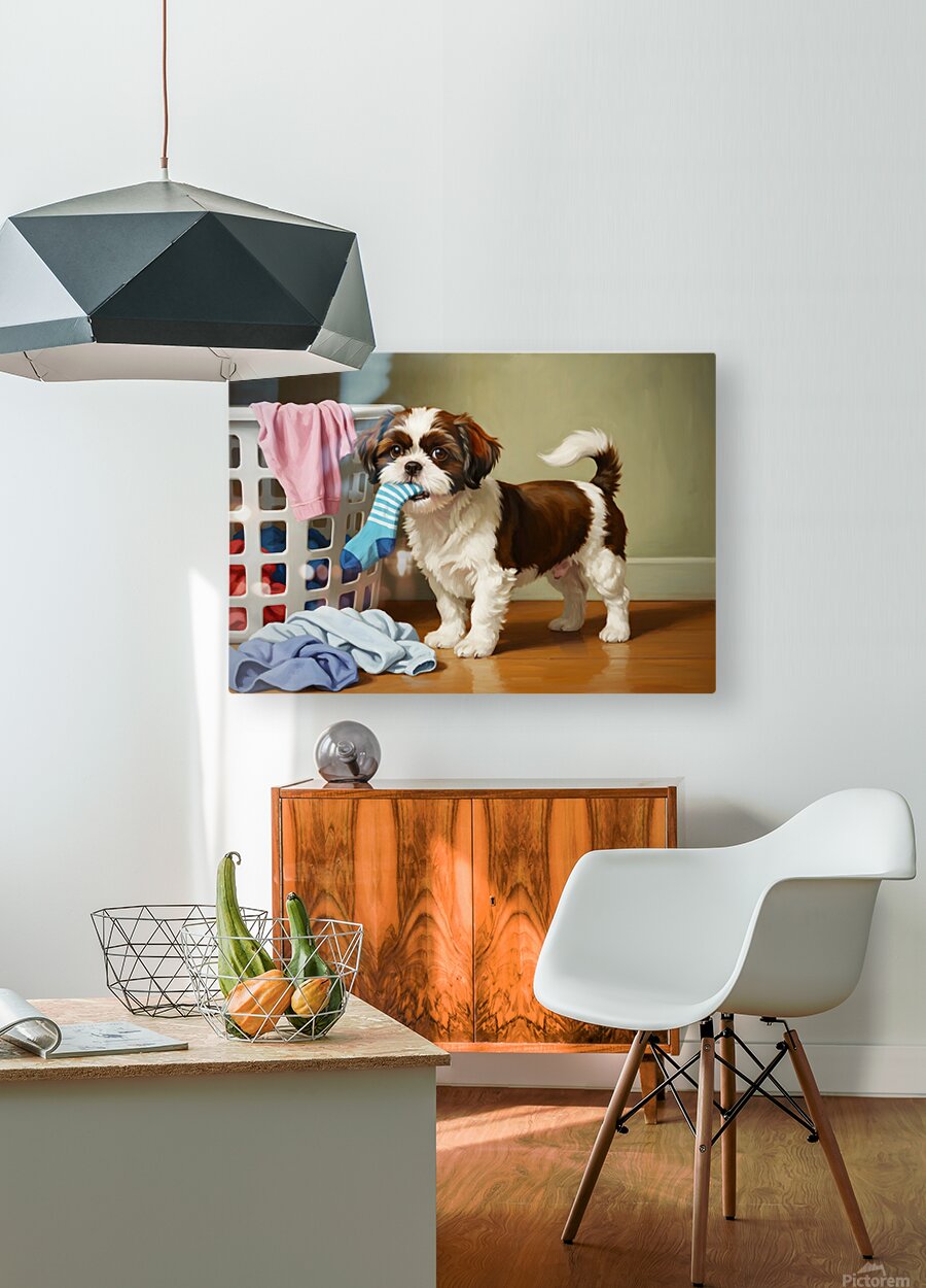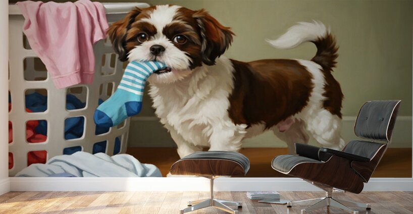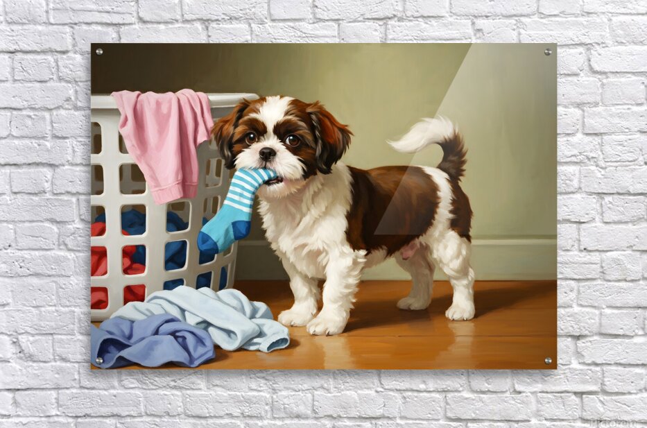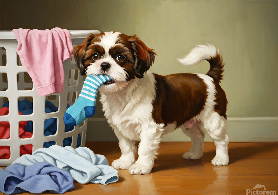 ABOUT THIS ARTWORK: PLAYFUL SHIH TZU PUPPY ESCAPES WITH STOLEN SOCK