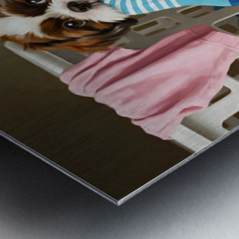 The brown and white Shih Tzu puppy bounds away with the striped sock streaming from its mouth displaying pure joy and mischief. The wooden hallway floor shows the puppys quick escape route. Digital Artwork.