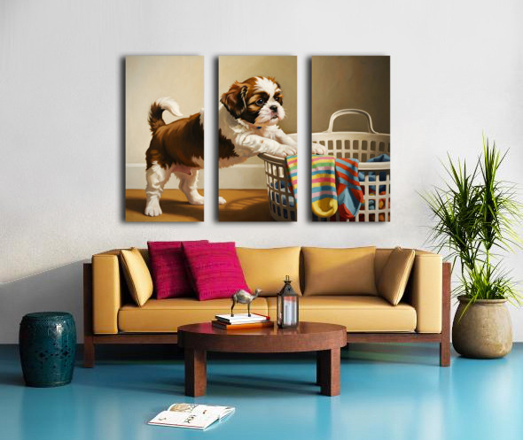 ABOUT THIS ARTWORK: SHIH TZU PUPPY SPOTS TEMPTING SOCK IN LAUNDRY BASKET