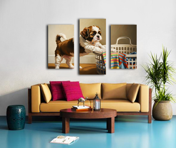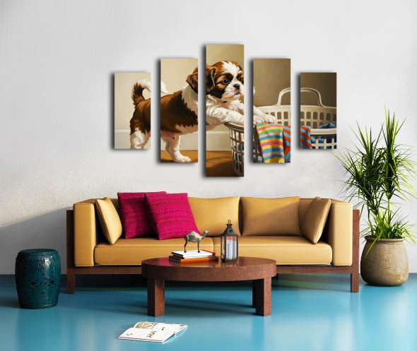 A brown and white Shih Tzu puppy with fluffy fur stands beside a wicker laundry basket. Colorful clothing fills the basket with a striped sock dangling over the rim catching the puppys attention in the cozy indoor setting. Digital Artwork.